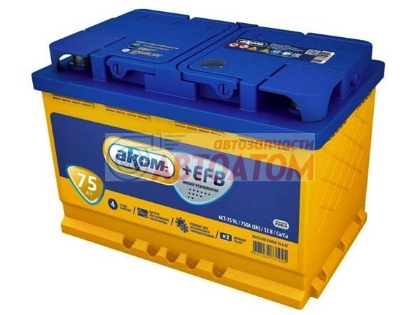 Виброустойчивая аккумуляторная батарея 6СТ-75 Аком EFB для легковых автомобилей с повышенным энергопотреблением.