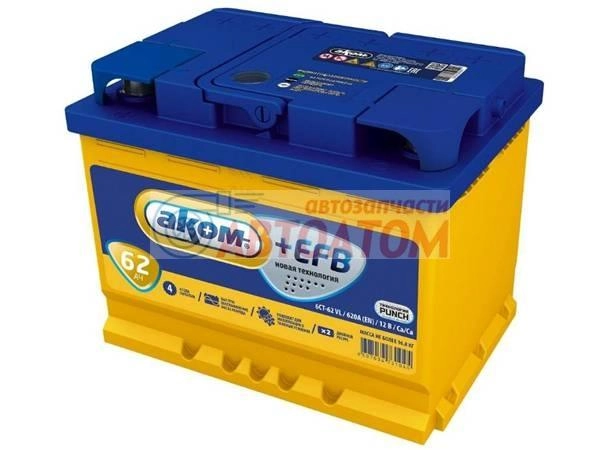 Виброустойчивая аккумуляторная батарея 6СТ-62 Аком EFB для легковых автомобилей с повышенным энергопотреблением.