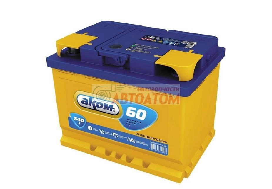 Автомобильный аккумулятор АКОМ 6СТ-60 для легковых автомобилей.